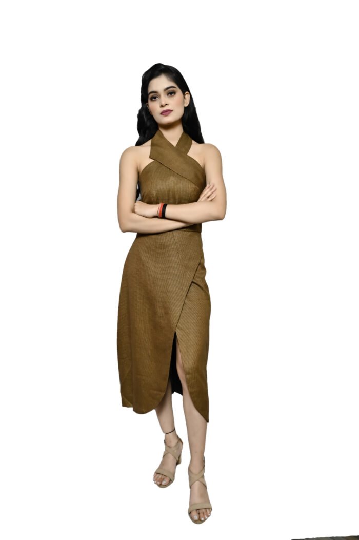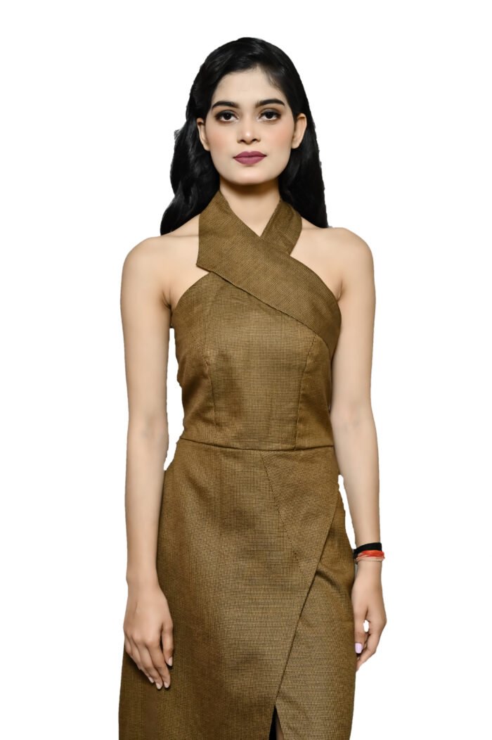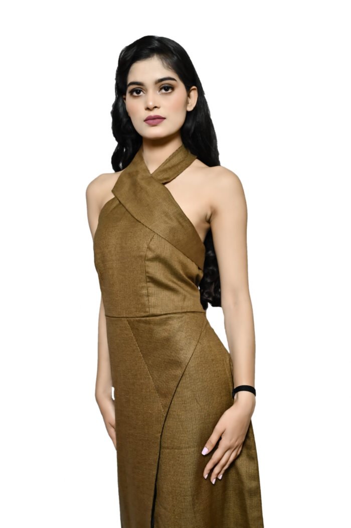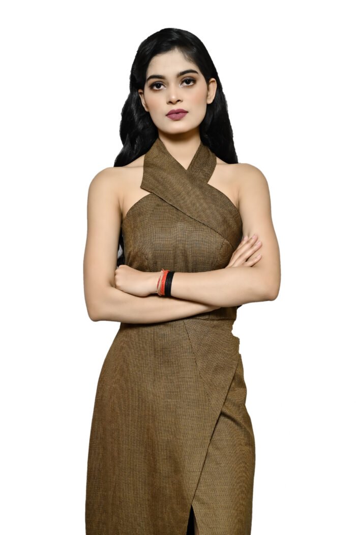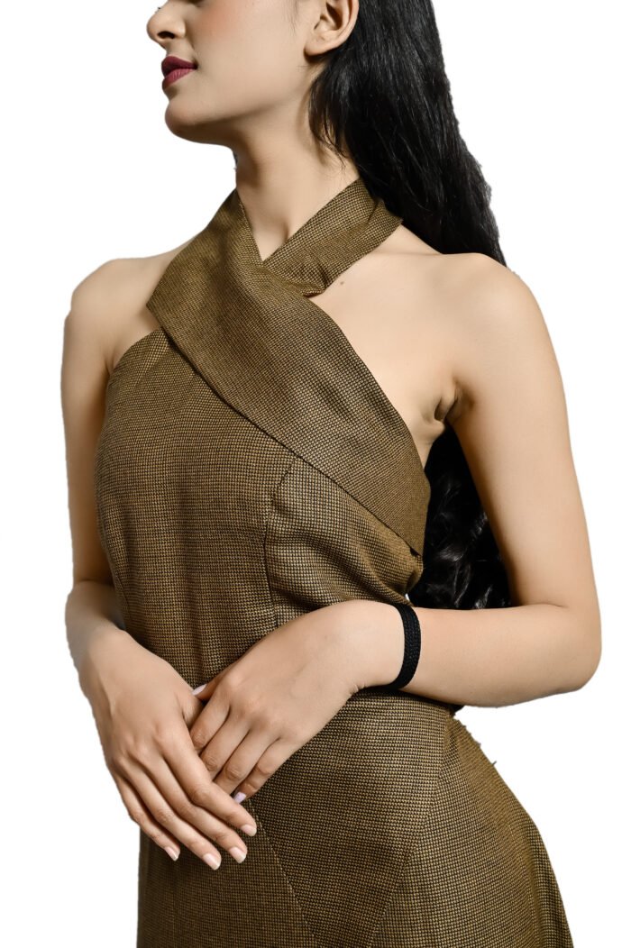 A halter neck woollen tweed dress perfect for winter parties and your day.